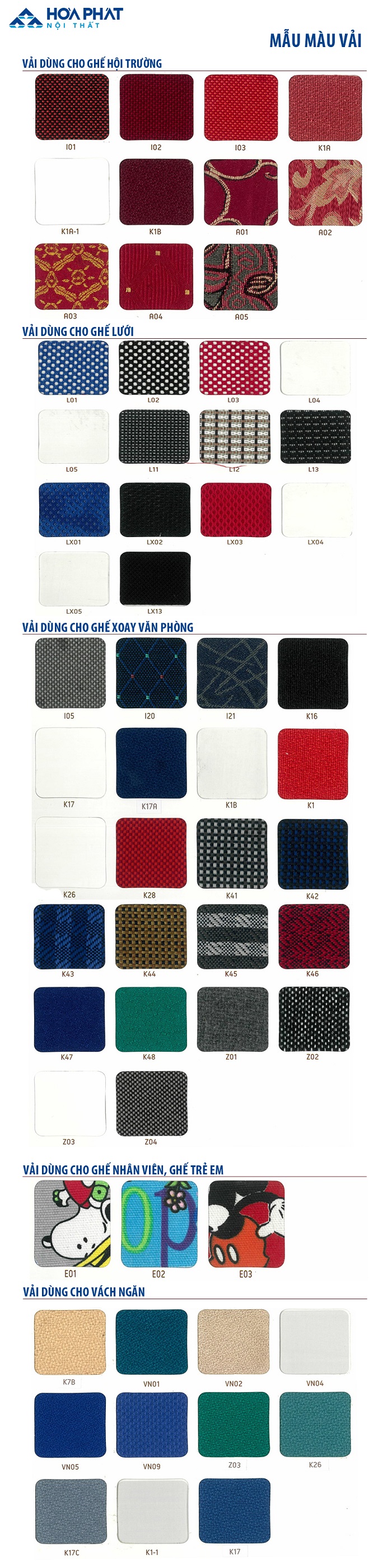 Bảng mẫu màu vải lưới, vải nỉ… tiêu chuẩn của Nội thất Hòa Phát dành cho các sản phẩm ghế văn phòng, ghế hội trường, ghế gấp, ghế lưới…