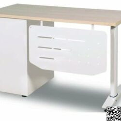 Chất liệu: Mặt gỗ công nghiệp Melamine màu tiêu chuẩn M14. Chân, hộc và yếm màu trắng S26. Tay nắm âm màu cam