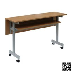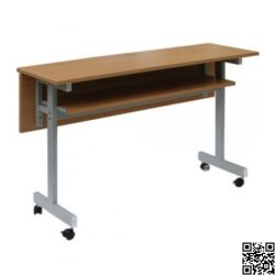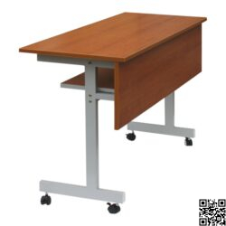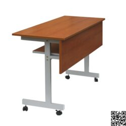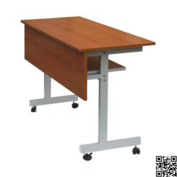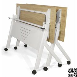 Kiểu dáng: Bàn làm việc chân sắt. Chân bàn dạng gấp, chân thép, chất liệu sơn tĩnh điện trắng. Mặt bàn chữ nhật chất liệu gỗ công nghiệp phủ Melamine (MFC) cao cấp. Bàn gấp có 4 bánh xe, có hãm lại. Sản phẩm bàn đào tạo khung thép gấp kết hợp với GHẾ LƯỚI The One và HỘC DI ĐỘNG cho phòng làm việc tạo nên sự hiện đại cho không gian văn phòng