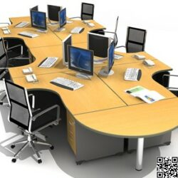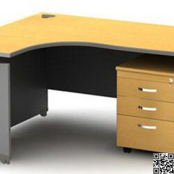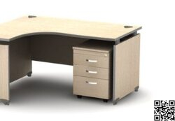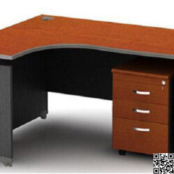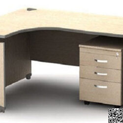 Kiểu dáng: Bàn chưa bao gồm hộc tài liệu. Bàn làm việc mặt lượn chữ L. Cạnh ngắn bên tay trái người ngồi. Mặt và chân sử dụng giá đỡ nhựa chịu lực. Có 2 lỗ chạy dây trên mặt bàn. Cạnh bàn dán gờ (chão) pvc.