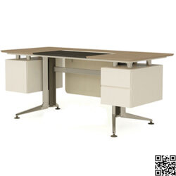 Kiểu dáng: Mặt bàn hình chữ nhật, các góc bo, bọc da phần ngồi viết. Hai chân bàn thiết kế phần trên dạng cột gắn hộp kỹ thuật và hộc treo, chân phía dưới sàn choãi ra dạng chữ V. Yếm treo lửng. Bàn không có tủ phụ.