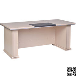 Kiểu dáng: Mặt bàn chữ nhật, góc cạnh sắc nét, viền dưới cạnh bàn ốp khác màu. Chân bàn ghép hộp, đế chân trang trí chỉ nổi viền. Yếm bàn giật cấp, trang trí ốp nổi.