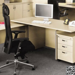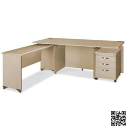 Kiểu dáng: Bàn chính có hồi bàn thiết kế lùi vào để vừa mỗi bên 1 hộc & 1 tủ phụ. Có 02 lỗ chạy dây. Yếm sát đất. Mặt và chân sử dụng giá đỡ mặt bàn. Bàn phụ mặt chữ nhật, yếm lửng phẳng. Hộc tài liệu di động 3 ngăn kéo. Các cạnh bàn đều được bo tròn forming phía người sử dụng.