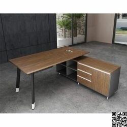 Kiểu dáng: Mặt bàn hình chữ nhật có các cạnh sắc nét, phía trước bàn là tấm yếm treo lửng được trang trí dạng hình thang vát góc. Khung chân bàn là thép định hình dập vát đế, mạ đen bóng.
